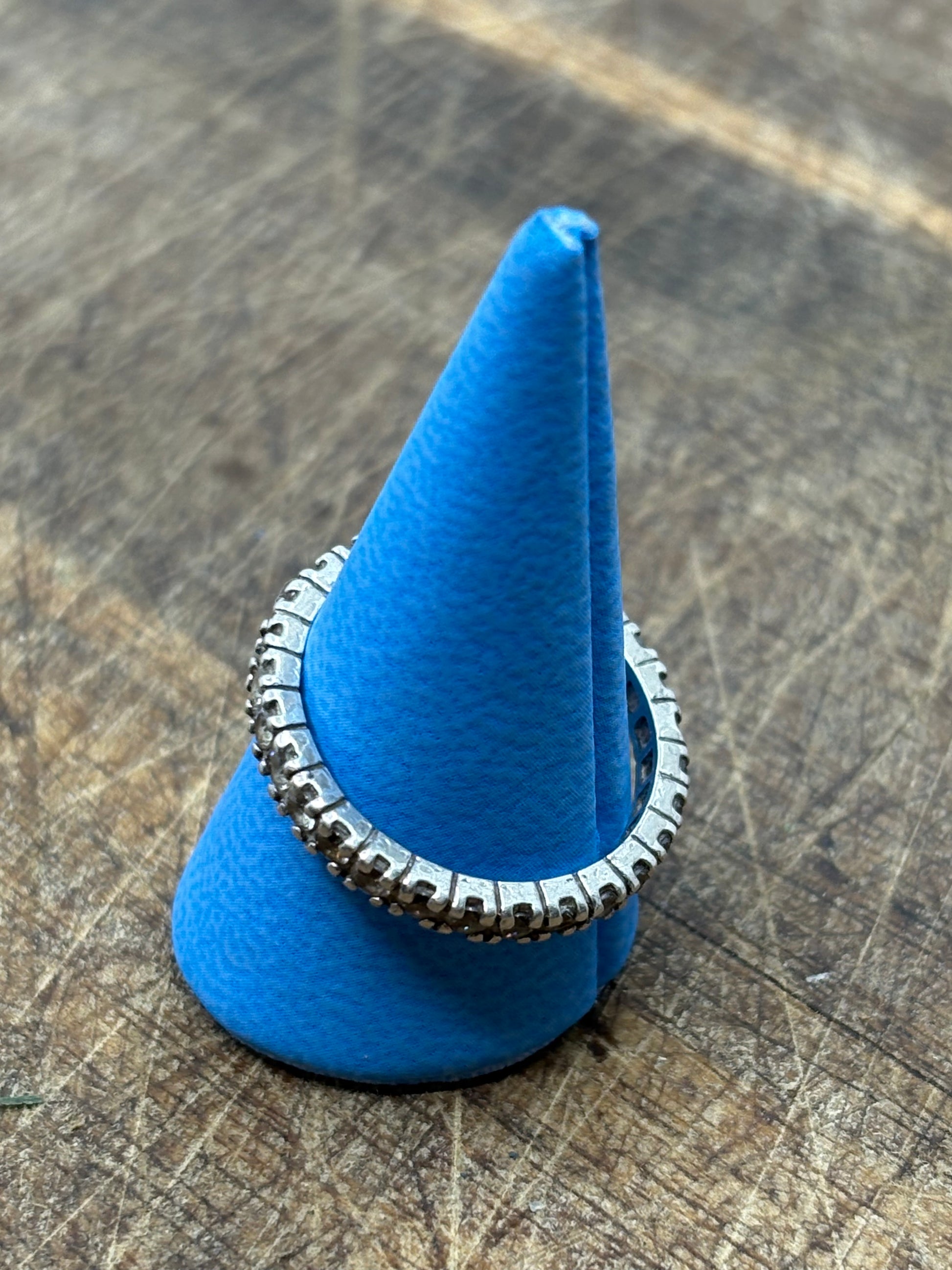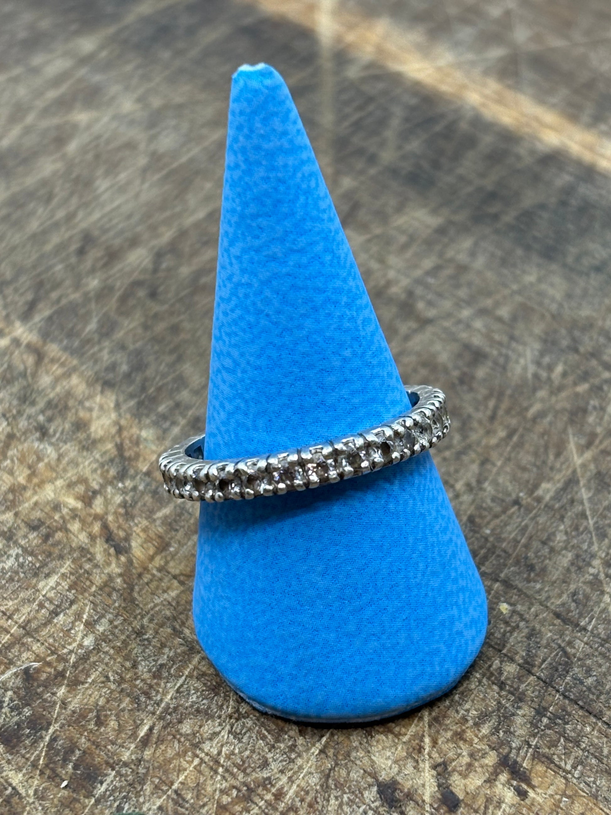 This solid silver eternity ring is set with stunning stones, creating a timeless and elegant piece of jewelry. Crafted with expert precision, this ring is a beautiful addition to any outfit and will add a touch of sophistication to your look. Perfect for any special occasion or daily wear, it is sure to make a lasting impression.
